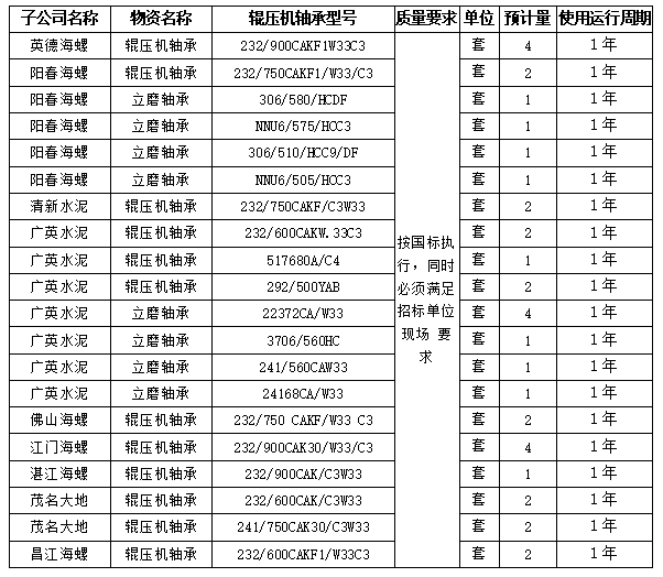 根据2021年度立磨、水泥磨辊压机轴承需求,拟对海螺水泥广东区域(英德海螺、阳春海螺、清新水泥、广英水泥、佛山海螺、江门海螺、茂名大地、湛江海螺、昌江海螺)2021年度立磨、水泥磨辊压机国产轴承进行公开招标,为进一步体现公平、公正、公开的原则,选择经营能力较好、经营资质合格、保供和服务能力较强的国产轴承资质渠道,欢迎具备条件的生产厂家,或正式授权代理商、经销商等单位参加,现将有关事项公示如下: